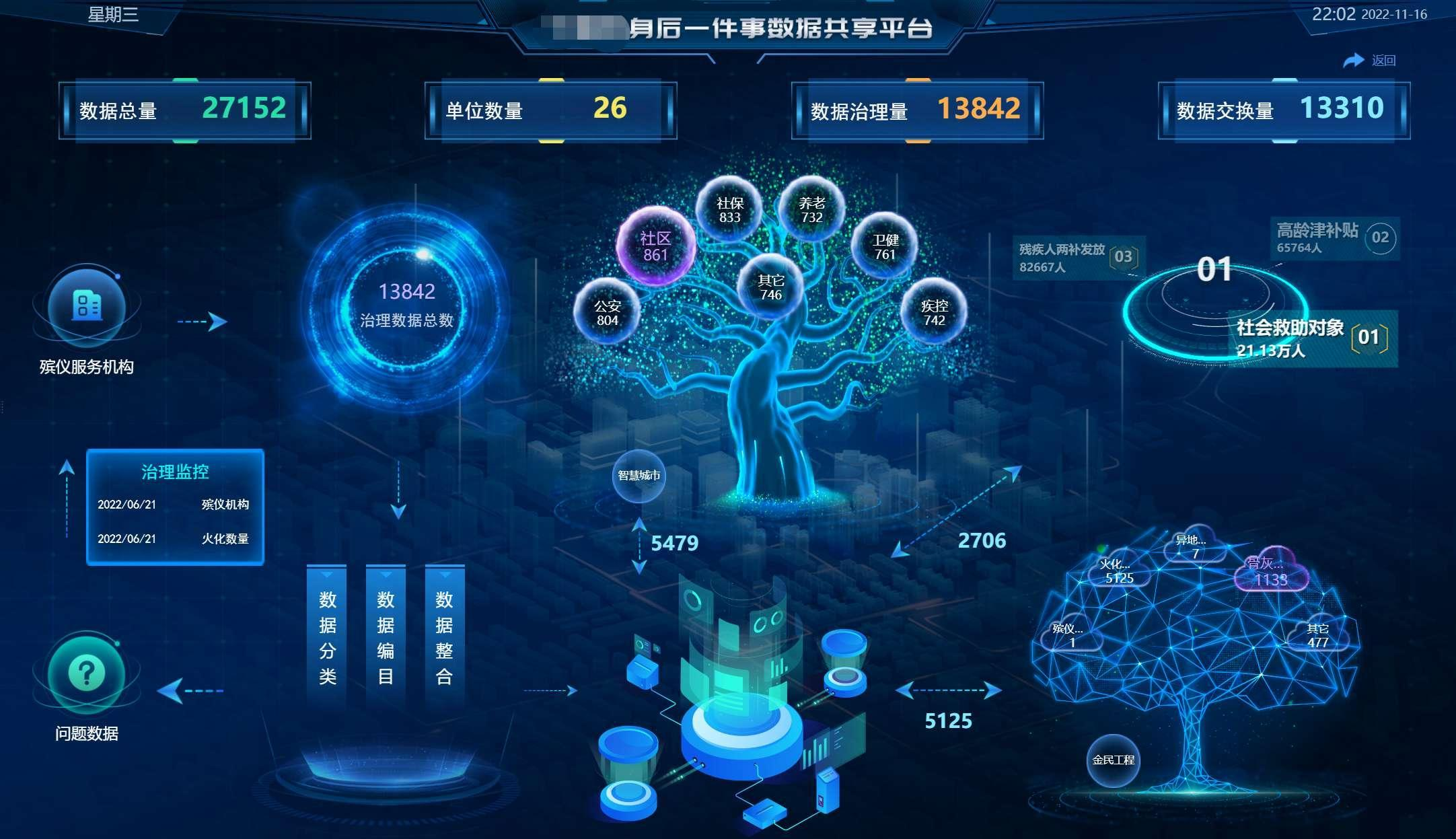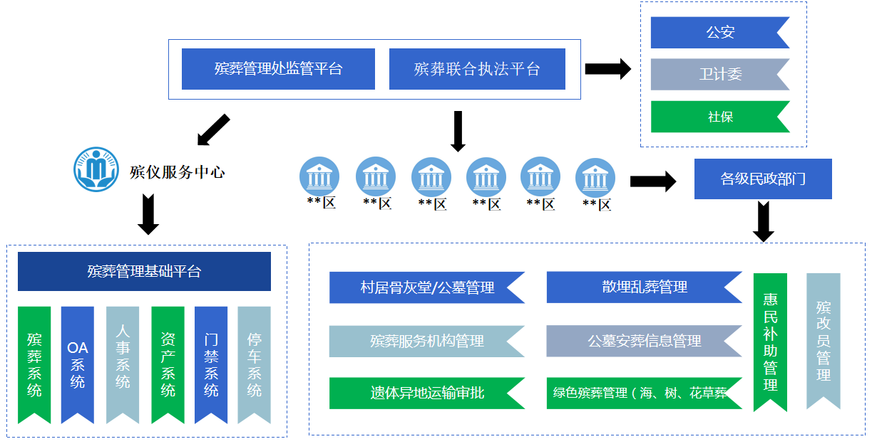 1、建设统一的殡葬数据资源中心,采用数据集中的方式,全面梳理数据资源目录,统一数据标准,建设基础库、业务库、主题库、共享库、公共资源库等数据库,并建设配套的数据资源管理系统,统一存储和管理殡葬各类信息资源,实现民政殡葬数据底数清、数据准、情况明,保障殡葬数据的完整、准确、鲜活、一致、真实 的高价值与高可用,为“用数据说话、用数据管理、用数据服务、用数据决策”打下基础。